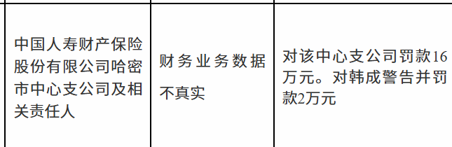 1月22日,哈密金融监管分局行政处罚信息公示列表显示,中国人寿财产保险股份有限公司哈密市中心支公司因财务业务数据不真实被罚款16万元。责任人韩某警告并罚款2万元。