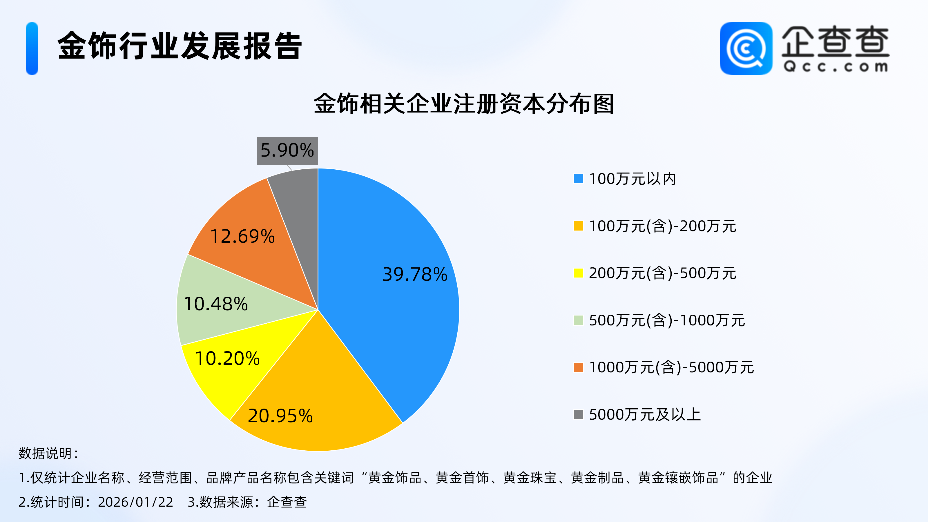 企查查数据显示,截至1月22日,国内现存金饰相关企业6.24万家。从经营时间来看,现存金饰相关企业大多为老牌企业,成立年限在5年以上的相关企业占比超七成,其中在5-10年的企业最多,占比46.25%,在10年以上的相关企业占比29.95%。注册量方面,2025年全年注册3901家金饰相关企业,截至目前,今年已注册186家。2.相关企业多为轻量级企业