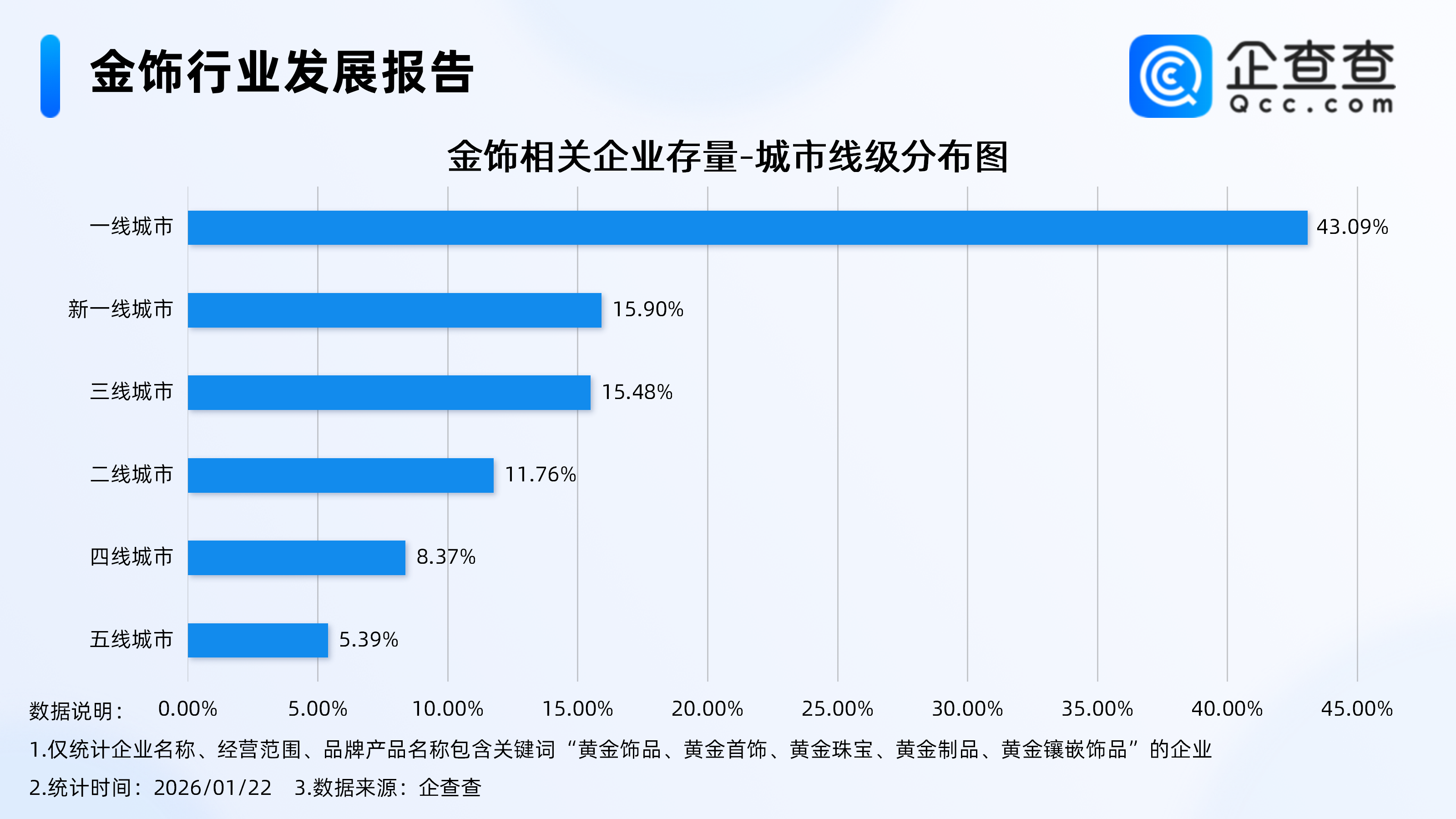 1月23日,现货黄金继续大涨,突破4900美元/盎司,最高报4967美元/盎司,刷新历史新高,日内涨超2%。与此同时,国内部分品牌金饰克价也有大幅上涨,创历史新高。其中,周生生足金饰品报1545元/克,较前一日1492元/克涨53元。老庙黄金足金饰品报1548元/克,较前一日1496元/克涨52元。老凤祥足金饰品报1538元/克,较前一日1495元/克涨43元。当前高金价背景下,中国消费者尤其是城市居民和职场人士日益倾向于轻便、模块化、个性化的金饰。据齐鲁壹点报道,某品牌金店员工介绍,金价上涨后,小克重金饰更受年轻人青睐,尤其是各类联名款和“马年”元素产品。此外,为吸引年轻消费者,各大金饰品牌推出IP联名款,其销量也颇为亮眼。企查查数据显示,截至1月22日,国内现存金饰相关企业6.24万家。从经营时间来看,现存金饰相关企业大多为老牌企业,成立年限在5年以上的相关企业占比超七成。从注册资本来看,金饰相关企业多为轻量级企业,注册资本在100万元以内的相关企业占比39.78%。从城市线级分布来看,金饰相关企业多分布在一线城市,占比达43.09%。注册量方面,2025年全年注册3901家金饰相关企业,截至目前,今年已注册186家。1.现存金饰相关企业6.24万家